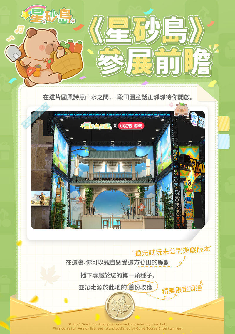 《星砂島》是由Seed Lab自研自發的一款治癒系模擬經營遊戲, 並由Game Source Entertainment(GSE)於PlayStation® 5 和Nintendo Switch™ 發行主機實體版。