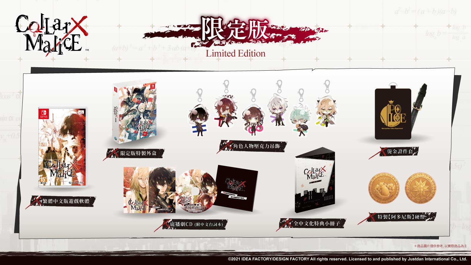 • 限定版內容物 : - 限定版特製外盒 - 全中文化特典小冊子 - 廣播劇CD(附中文台詞本) - 角色人物壓克力吊飾(全六組) - 燙金證件套 -【阿多尼斯】硬幣(附燙銀收納盒)
