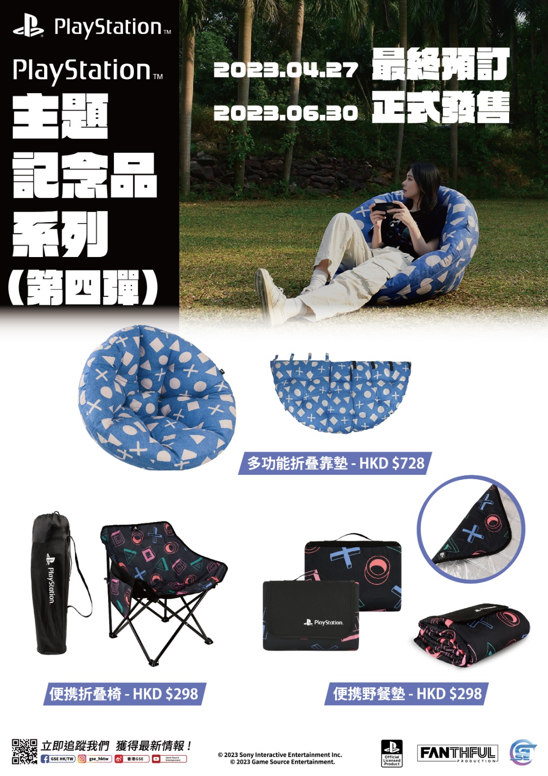 此次PlayStation最新系列周邊共包含3款,以戶外和家居為主題,選取了玩家們最為熟悉的視覺元素—— △○×□ —— 來自手把上的按鍵符號。分別為折疊椅、便攜野餐墊以及多功能折疊靠墊。三款周邊不僅是你外出遊玩的好道具,同樣也可以裝點在家中,一切都將由你決定,興趣「索」然,無「索」不能!