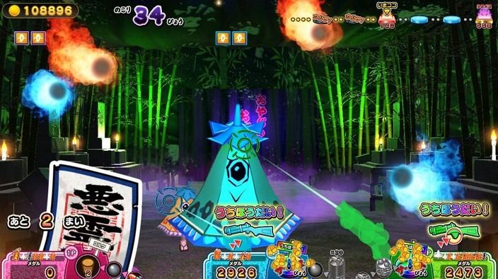 「硬幣模式」玩法相當簡單,透過 Joy-con 瞄準並射擊目標,將它成功擊落即可!不過目標可能會隨著移動的檯面,進行升降或旋轉,共有 24 種機關變化。而目標中其實也藏著埋伏的妖怪,只要擊敗一定數量的妖怪,就能進入「鬼屋」,在陰森的場景中與 boss 進行對決!對戰時除了攻擊幽靈之外,也別忘了利用「惡靈退散」符咒、鹽或御守等道具防禦。