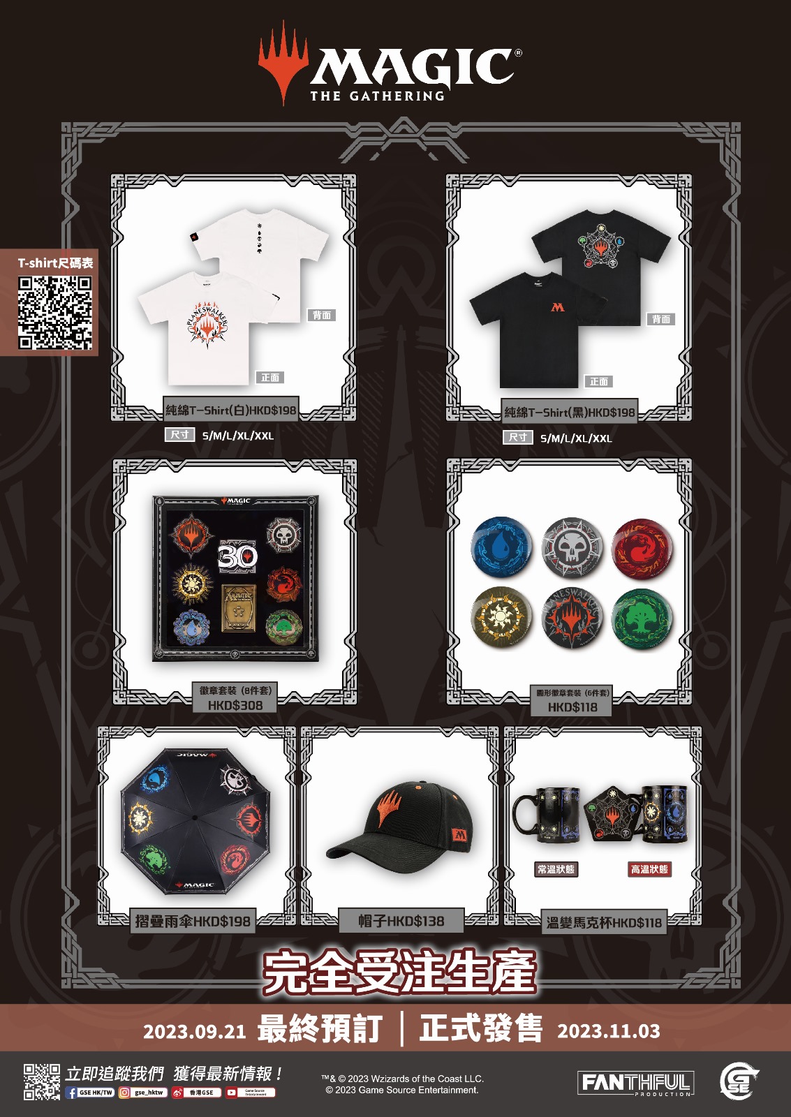 此次《萬智牌》系列周邊共包含7款周邊,以構建牌組的五種顏色標識為主題,不僅有T卹、彎檐帽雨傘等能夠融入日常生活的單品;亦有能夠彰顯牌組顏色標籤的圓形徽章;趣味性十足,遇熱顯色的馬克杯;當然充滿30週年紀念意義的金屬PIN套組,也極具收藏價值!