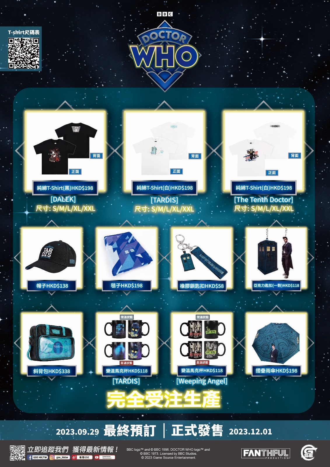 以大衛·田納特出演的第十任博士形象、時間領主的飛船TARDIS、戴立克、哭泣天使等來自劇中的經典外星生物形像作為視覺元素,進行設計創作。本次為各位帶來共11款周邊,涵蓋品類十分豐富。不少單品可玩性、趣味性十足,完美將“神秘博士”元素融入到粉絲、愛好者們的日常生活工作中!
