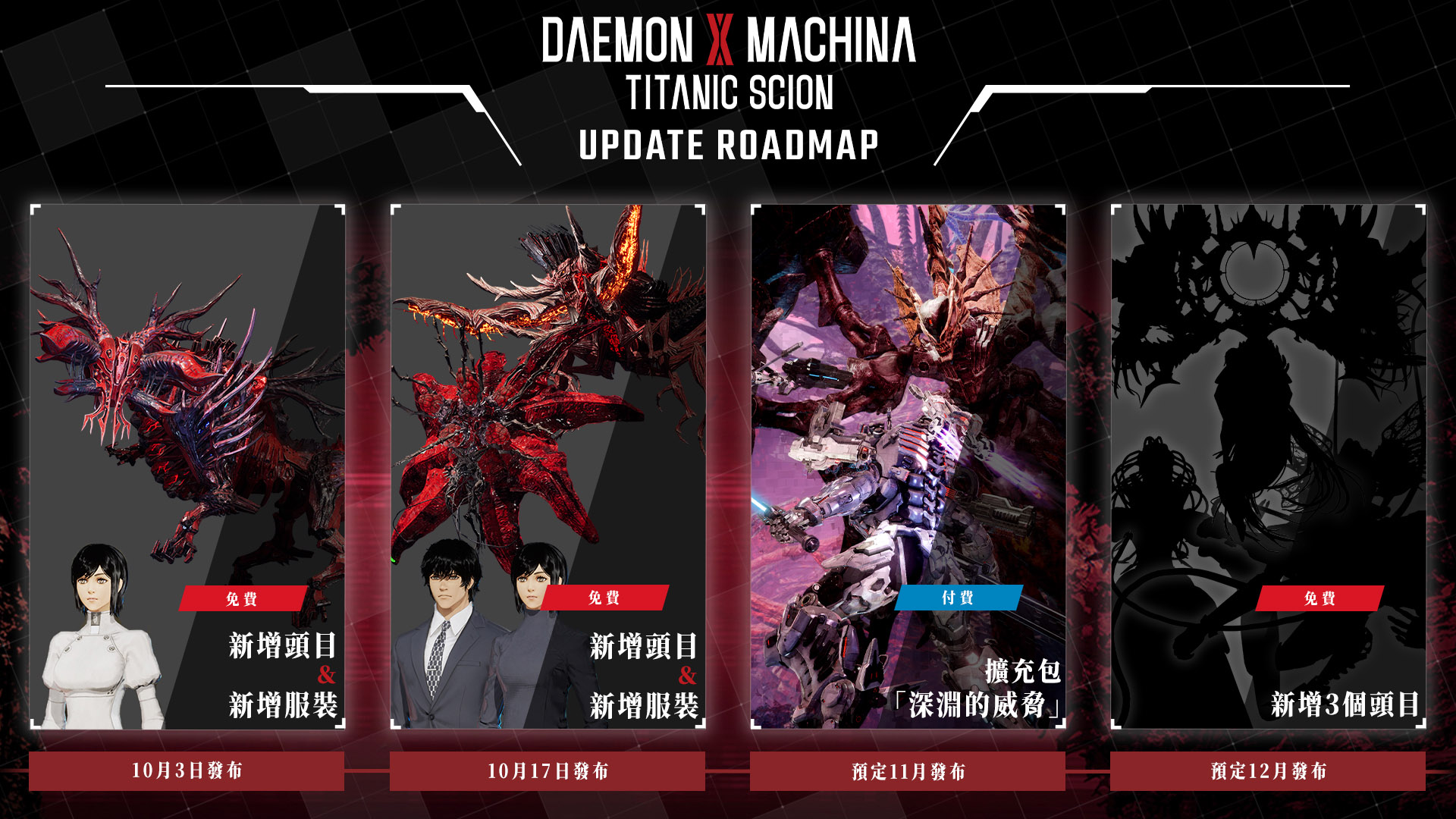 新頭目登場的免費更新確定發布。官方網站已公開更新計畫,第一彈將於 10 月 3 日推出。