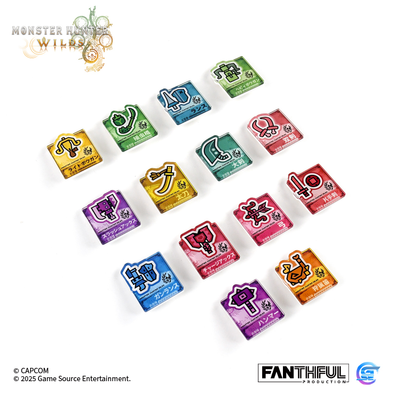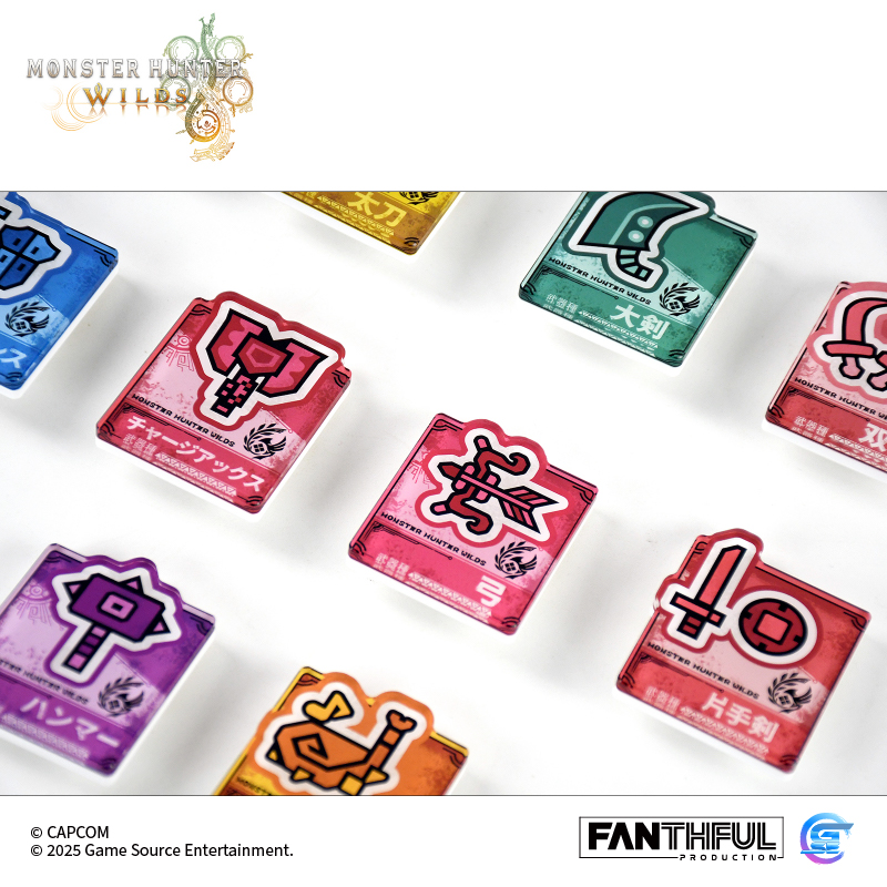 以遊戲中玩家們熟識的獵人武器圖標為主題設計的亞克力別針徽章。全14種風格各異的武器種類,悉數登場! 款式:大劍、太刀、單手劍、雙劍、大錘、狩獵笛、長槍、銃槍、斬擊斧、充能斧、操蟲棍、輕弩槍、重弩槍、弓,共14款盲盒包裝
