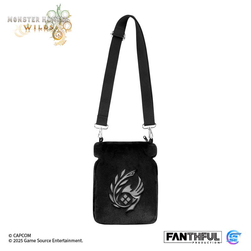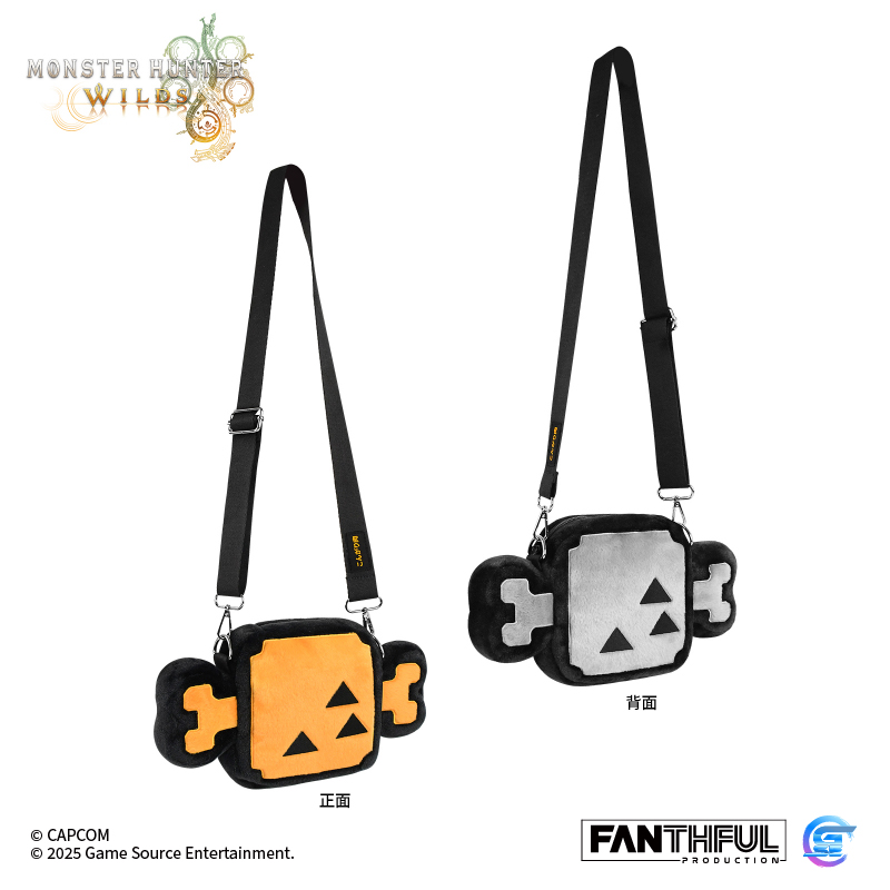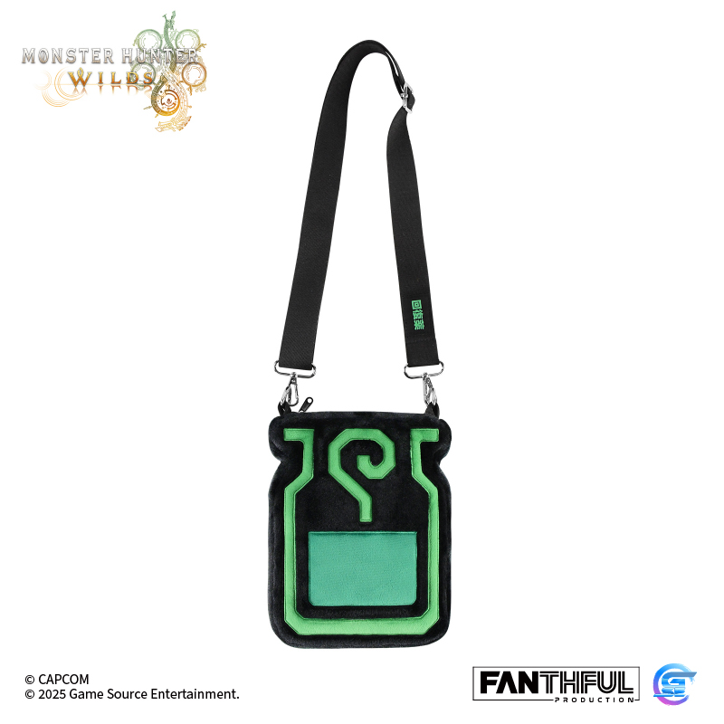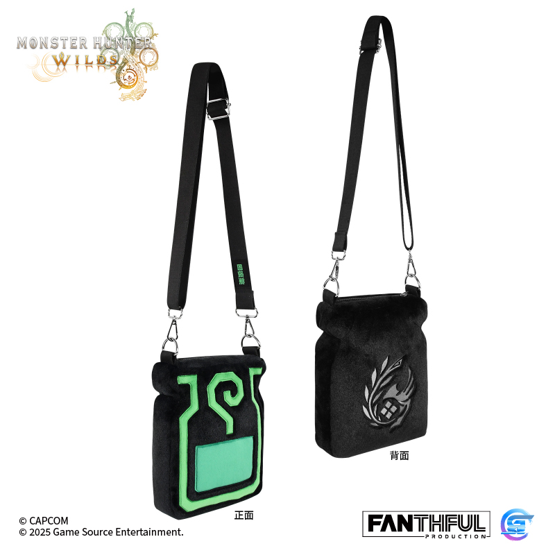 選取了遊戲中重要道具「神奇綠色飲料」——回復藥的圖案作為主題設計的毛絨包包,背面則是本次《Monster Hunter Wilds》中登場的調查隊隊徽圖標,背帶上也點綴了綠色字樣,細節滿滿!